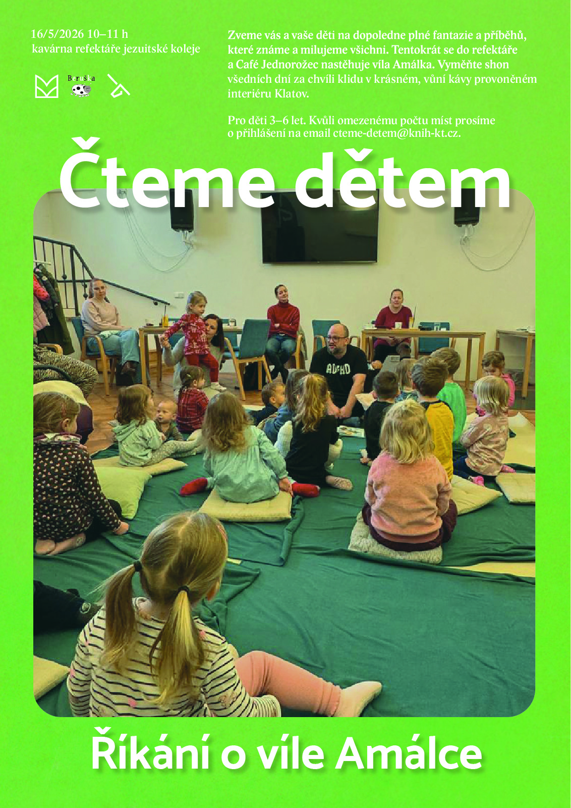 Zveme vás a vaše děti na dopoledne plné fantazie a příběhů, které známe a milujeme všichni. V sobotu 16. května 2026 od 10.00 do 11.00 hodin si v refektáři a Café Jednorožec společně přečteme z knihy Říkání o víle Amálce. Vyměňte shon všedních dní za chvíli klidu v krásném, vůní kávy provoněném interiéru Klatov. Pro děti 3–6 let. Kvůli omezenému počtu míst prosíme o přihlášení na e-mail cteme-detem@knih-kt.cz. Vstup zdarma. (Zapsal: Městská knihovna Klatovy, 17.04.26) | ||